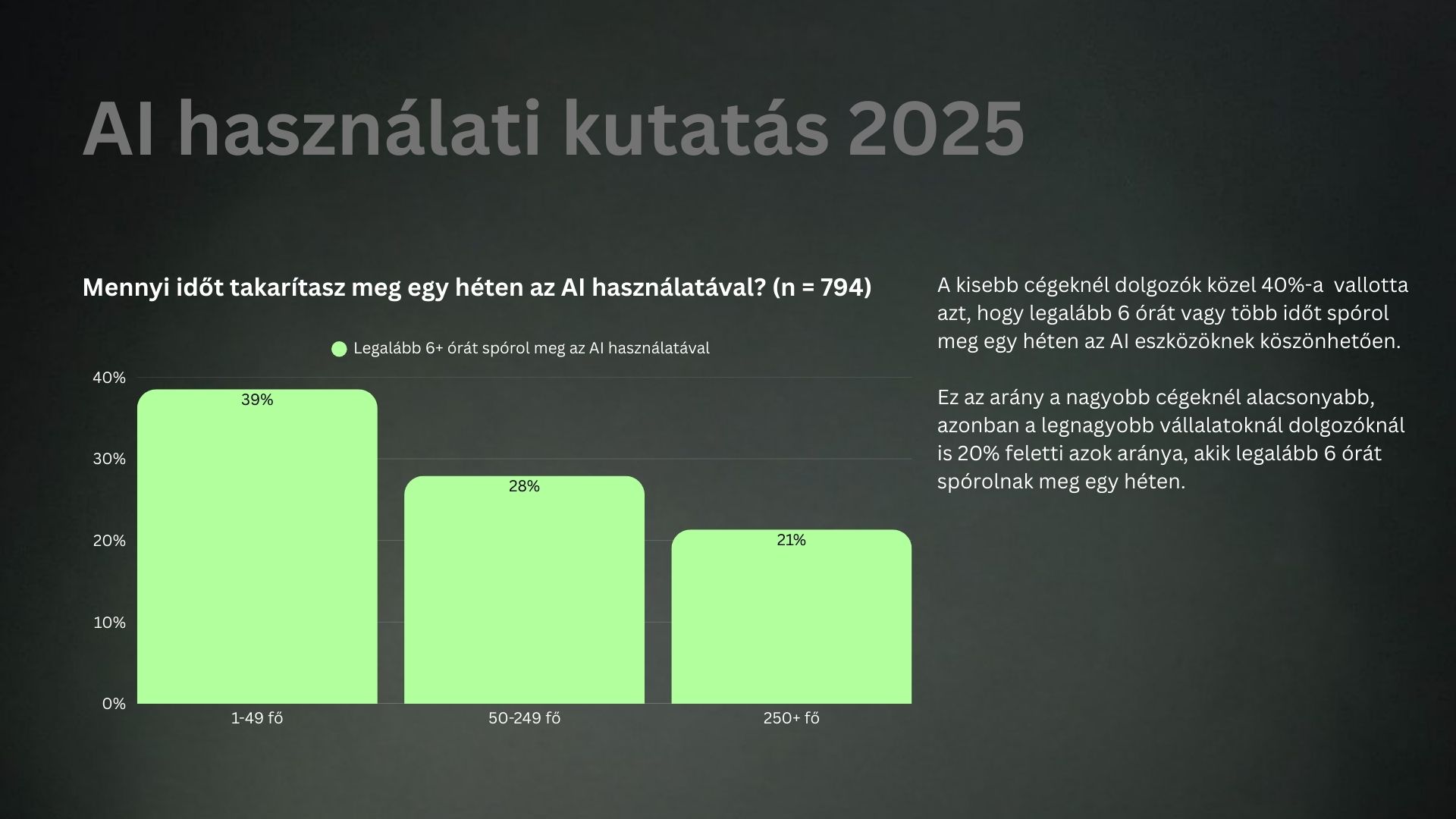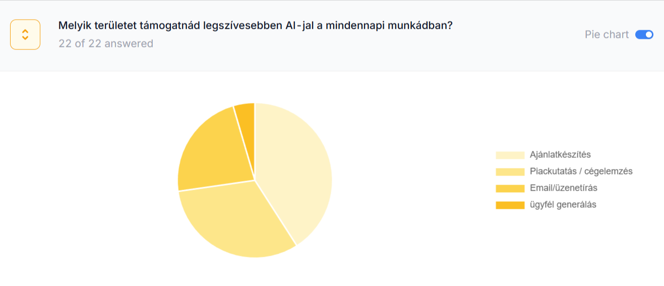 Az oktatást megelőzően online kérdőívben mértük fel a résztvevők AI-érettségét. A válaszokból kiderült, hogy legtöbben már kipróbálták a generatív eszközöket, de a használat rendszertelen volt: hiányzott az egységes policy, az eszközválasztási iránytű és a „mit mikor, hogyan” szempontrendszer. A felmérés alapján priorizáltunk: kutatás/összegzés, sales-támogatás, majd belső riport-standardizálás.